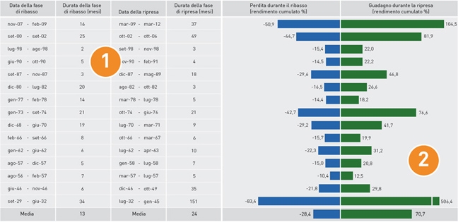 Questo grafico mostra la durata media e la gravità delle fasi di ribasso (definite come calo del 10% rispetto al precedente picco di mercato) e di ripresa dal 1929. Storicamente, le fasi di ribasso hanno avuto una durata media di 13 mesi e quelle di ripresa di circa 24.