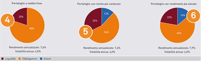 Detenere una combinazione di azioni, obbligazioni e liquidità rappresenta un'opzione che ben si addice a molti investitori. L'entità degli investimenti nelle singole asset class dipende da diversi fattori, tra cui, in particolare, l'orizzonte temporale e l'obiettivo dell'investimento in termini di rischio e rendimento (obiettivo finanziario).