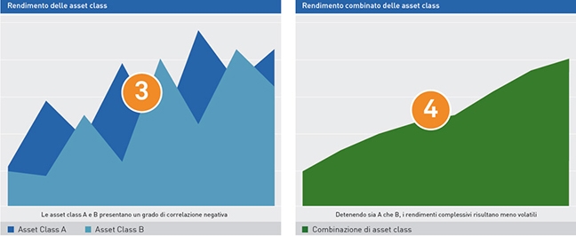 Questo grafico indica come un bassa correlazione tra due asset class può aiutare a ridurre sensibilmente il rischio di un portafoglio. Le asset class A e B presentano una correlazione negativa (A sale quando B scende e viceversa). Inoltre sia A che B, se prese singolarmente, sono altamente volatili.